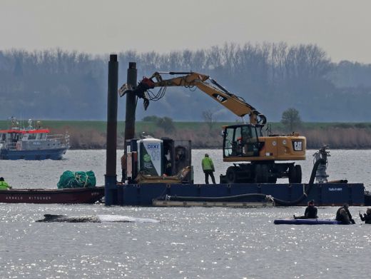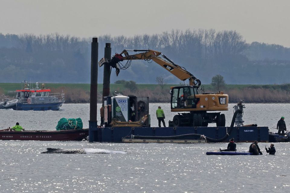 Der Rettungsversuch für den Wal vor Poel schreitet langsam voran. Inzwischen ist eine Plattform mit Bagger in der Nähe angekommen. Experten sehen kaum Überlebenschancen für das Tier.