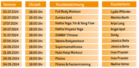 Es können verschiedene Kurse wie Full Body Workout,Zumba,Yoga,Hula-Hoop oder Pilates ausprobiert werden. Gleich drei neue Kursleiterinnen dürfen wir in diesem Jahr begrüßen: Anja Lang mit Hatha Yoga: Yin & Yang Flow,Sindy Krüger-Kiymazarslan mit Zumba Fitness und Jessica Belle mit den Kursen Tabata und Supermamafitness.