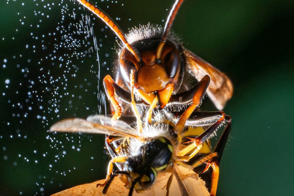 Asiatische Hornisse (oben) beim Verspeisen einer Wespe
