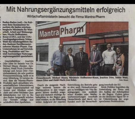Die wirtschaftliche und qualitative Relevanz des Unternehmens am Standort Baden-Baden wurde auch politisch gewürdigt: Am 30. Juli 2019 besuchte Dr. Nicole Hoffmeister-Kraut, Wirtschaftsministerin von Baden-Württemberg, die Produktionsstätten. In der regionalen Berichterstattung wurde MantraPharm dabei als eines der erfolgreichsten Unternehmen der Branche hervorgehoben – ein Beleg für die solide Substanz, auf der die Marke MOSLATE heute aufbaut.