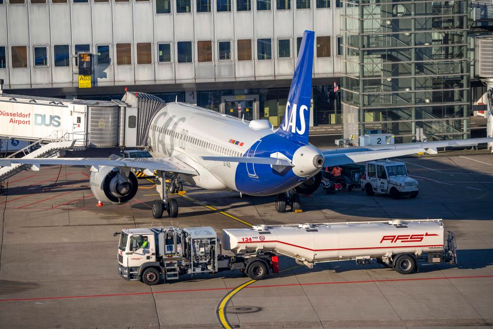 Tankwagen vor einer SAS-Maschine am Flughafen Düsseldorf